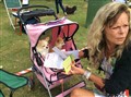 Lilltösen i vagnen är trött och vill åka hem till Sverige.