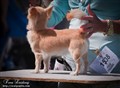 "10 months, shows quit well, nice head proportion, excellent topline, instending nice front and hindquerterengulation, excellent coat, movement in front very well"
